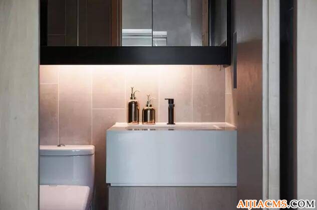 卫生间的内饰,灯光藏在壁沿之中既不浪费空间灯源的照明还更加精确。