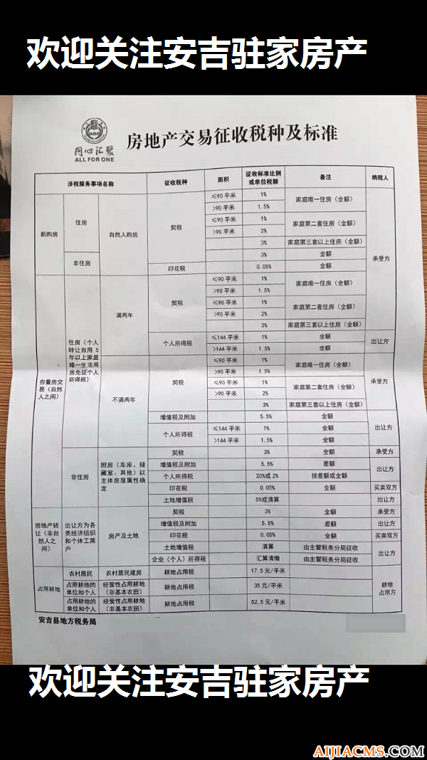 安吉二手房交易税费,按>90<140来算,卖方二套,买方首套,3%,买方二套,卖方首套,2%买卖双方都是唯一住宅1.5%,买卖双方都是二套且不满两年,8.5-9%所以要买房最好是房东首套房且满两年的