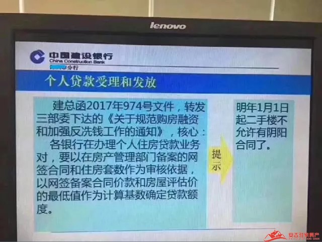 近期,在朋友圈看到的,某市建行的业务通知,告诉我们:从1月1日开始“二手楼不允许有阴阳合同了”。因为要以“网签备案合同价款和房屋评估价的最低值作为计算基数确定贷款额度”。
